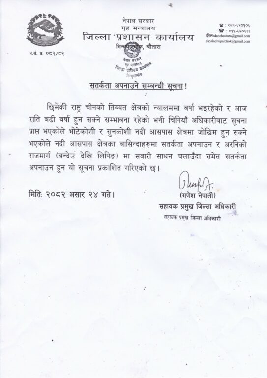 ‘छिमेकी राष्ट्र चीनको तिब्बत क्षेत्रको न्यालममा वर्षा भइरहेको र आज राति बढी वर्षा हुनसक्ने सम्भावना रहेको भनी चिनियाँ अधिकारीहरुबाट सूचना प्राप्त भएकाले भोटेकोशी र सुनकोशी नदी आसपास क्षेत्रमा जोखिम हुनसक्ने भएकोले नदी आसपास क्षेत्रका बासिन्दाहरुमा सतर्कता अपनाउन र अरनिको राममार्ग (बन्देउदेखि लिपिङ) सवारी साधन चलाउँदा समेत सतर्कता अपनाउनु हुन यो सूचना प्रकाशित गरिएको छ,’ सहायक प्रमुख जिल्ला अधिकारी गणेश नेपालीले विज्ञप्ति जारी गर्दै भनेका छन् ।