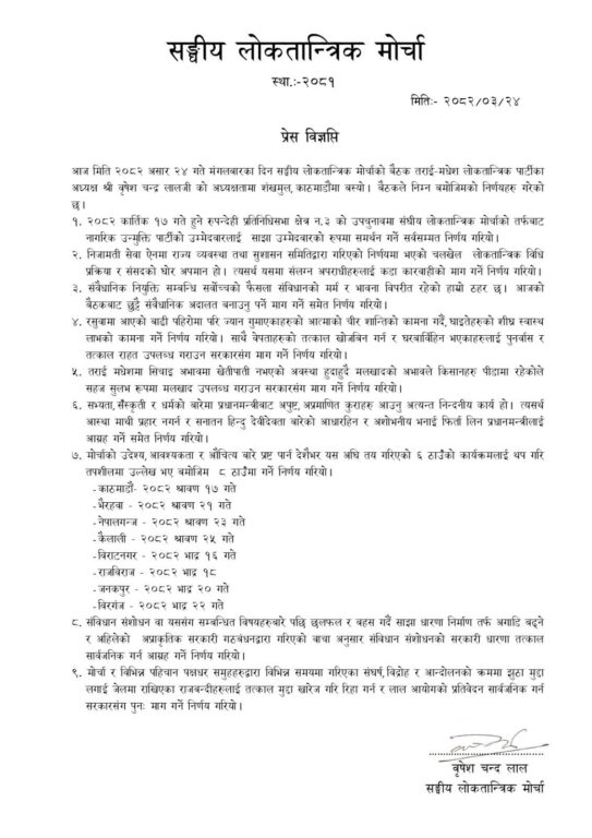 ‘२०८२ कार्तिक १७ गते हुने रुपन्देही प्रतिनिधि सभा क्षेत्र नं ३ को उपचुनावमा संघीय लोकतान्त्रिक मोर्चाको तर्फबाट नागरिक उन्मुक्ति पार्टीको उम्मेदवारलाई साझा उम्मेदवारको रुपमा समर्थन गर्ने सर्वसम्मत निर्णय गरियो,’ जारी निर्णयमा भनिएको छ ।