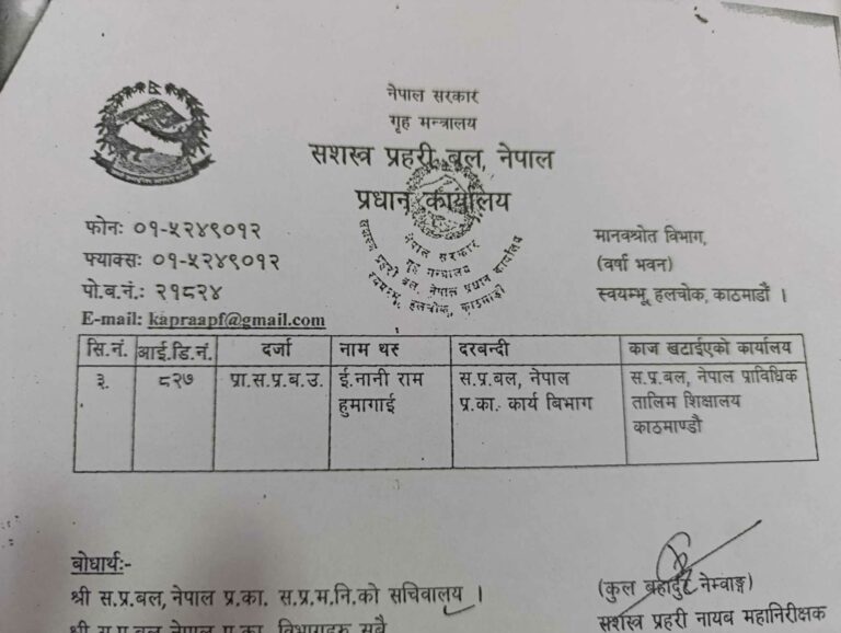 यस्तै, प्राविधिक सशस्त्र प्रहरी वरिष्ठ उपरीक्षक ई. नानीराम हुमागाईंलाई कार्य विभागबाट नेपाल प्राविधिक तालिम शिक्षालय, काठमाडौंमा काज सरुवा गरिएको छ ।