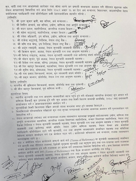 आर्थिक वर्ष २०८२/८३ को बजेटमार्फत् सुनको कारोबारमा २ प्रतिशत विलासिता कर र हीरा जडित गरगहनामा १३ प्रतिशत मूल्य अभिवृद्धि कर (भ्याट) लगाउने निर्णयपछि व्यवसायीहरू आन्दोलित बनेका थिए ।
