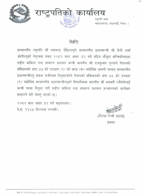 त्यसपछि आजै अपरान्ह प्रधानमन्त्री ओलीको सिफारिसमा राष्ट्रपति पौडेलले मन्त्री नियुक्त गरेका हुन् ।