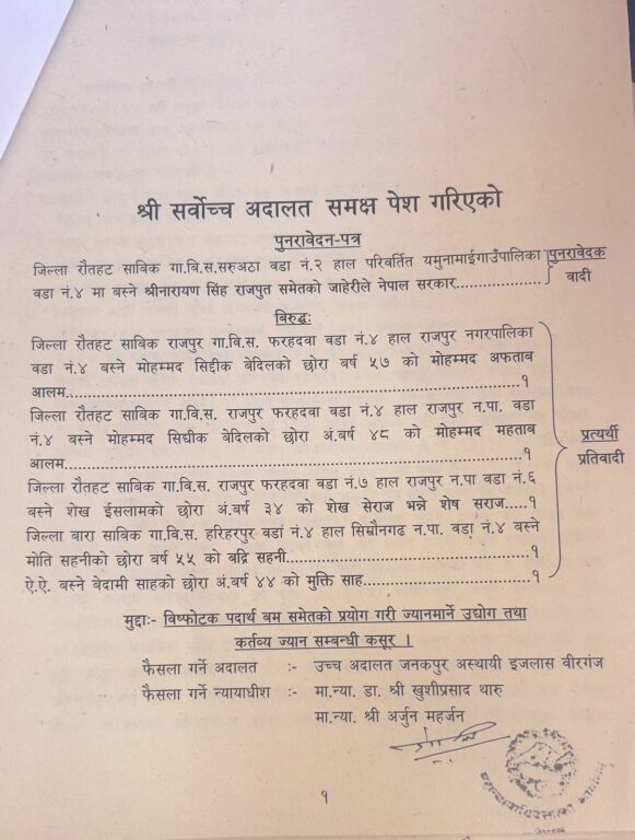 गत १४ जेठमा उच्च अदालतको वीरगन्ज इजलासका न्यायाधीशहरू डा. खुसीप्रसाद थारु र अर्जुन महर्जनको इजलासले ज्यानमुद्दाका आरोपितहरू मोहम्मद आफताब आलमलगायतलाई आरोपबाट सफाइ दिने फैसला गरेका थिए ।