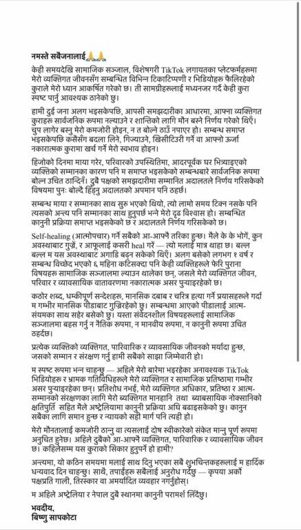 ‘हिजोको दिनमा माया गरेर, परिवारको उपस्थितिमा, आदरपूर्वक घर भित्र्याएको व्यक्तिको सम्मानका कारण पनि म समाप्त भइसकेको सम्बन्धबारे सार्वजनिक रुपमा बोल्न उचित ठाँनिन् । दुवै पक्षको समझदारीमा सम्मानित अदालतले निर्णय गरिसकेको विषयमा पुनः बोल्दै हिँड्नु अदालतको अपमान पनि ठहर्छ,’ उनले भनेका छन् ।