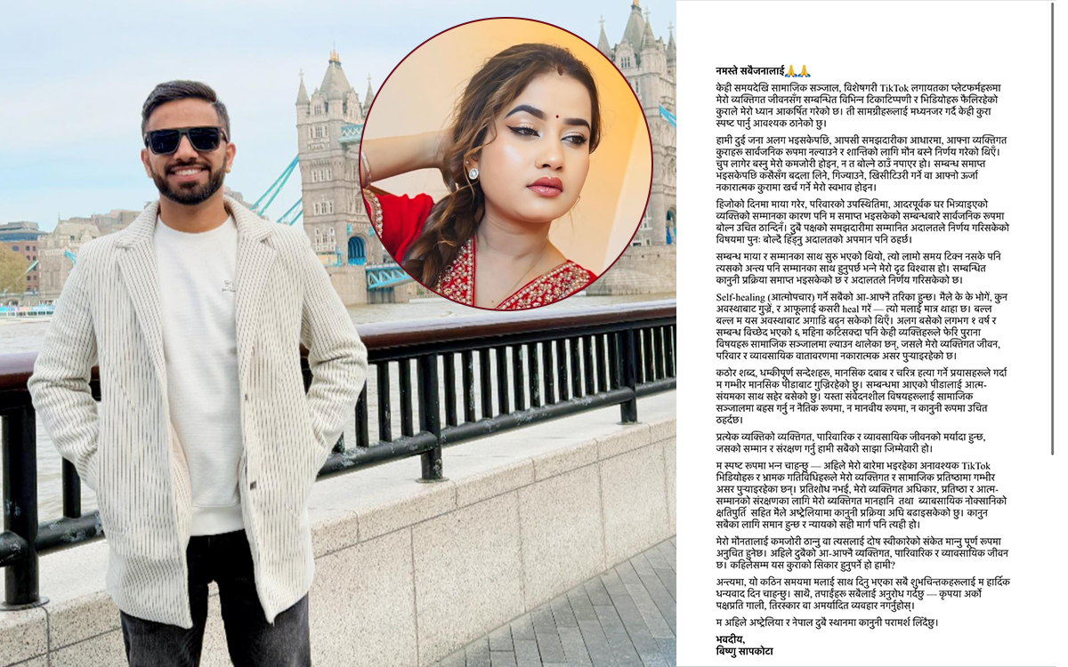 ‘कठोर शब्द, धम्कीपूर्ण सन्देशहरु, मानसिक दबाब र चरित्र हत्या गर्ने प्रयासहरुले गर्दा म गम्भीर मानसिक पीडाबाट गुज्रिरहेको छु । सम्बन्धमा आएको पीडालाई आत्मसंयमका साथ सहेर बसेको छु । यस्ता संवेदनशील विषयहरुलाई सामाजिक सञ्जालमा बहस गर्नु न नैतिक रुपमा, न मानवीय रुपमा, न कानुनी रुपमा उचित ठहर्छ,’ उनले सामाजिक सञ्जालमा लेखेका छन्, ‘प्रतिशोध नभई, मेरो व्यक्तिगत अधिकार, प्रतिष्ठा र आत्मसम्मानको संरक्षणका लागि मेरो व्यक्तिगत मानहानी तथा व्यवसायीक नोक्सानीको क्षतिपुर्तिसहित मैले अष्ट्रेलियामा कानुनी कारबाही अघि बढाइसकेको छु ।’