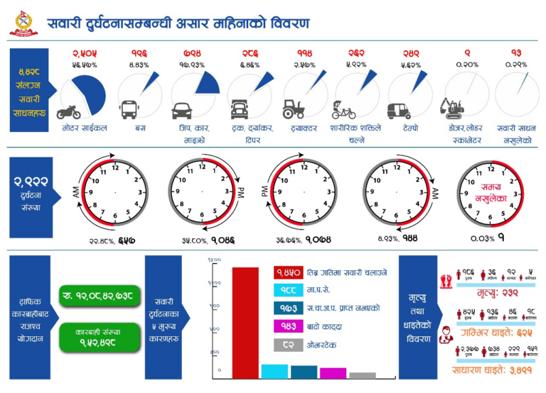 जसमा २३९ जनाको मृत्यु भएको छ भने ४ हजार ११६ जना घाइते भएका छन् । मृत्यु हुनेमा पुरुषको संख्या १८६, महिला ३६, बालबालिका १७ जना रहेका छन् । यो सार्वजनिक गरिएको विवरण हेर्ने हो भने सबै भन्दा धेरै मोटरसाइकल दुर्घटना भएको देखिन्छ । मोटरसाइकल दुर्घटना कुल सवारी दुर्घटना (२ हजार ५०५) को ५६.५७% भएको छ । त्यस्तै बस ४.४३% जिप-कार १७.९३%, ट्रक-ट्यांकर ६.४६% र ट्याक्टर २.५७% रहेका छन् ।