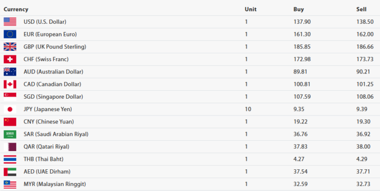 राष्ट्र बैंकले हङकङ डलर एकको खरिददर १७ रुपैयाँ ५७ पैसा र बिक्रीदर १७ रुपैयाँ ६४ पैसा, कुवेती दिनार एकको खरिददर ४५१ रुपैयाँ ५८ पैसा र बिक्रीदर ४५३ रुपैयाँ ५५ पैसा, बहराइन दिनार एकको खरिददर ३६५ रुपैयाँ ७८ पैसा र बिक्रीदर ३६७ रुपैयाँ ३७ पैसा, ओमनी रियाल एकको खरिददर ३५८ रुपैयाँ १७ पैसा र बिक्रीदर ३५९ रुपैयाँ ७३ पैसा रहेको छ ।