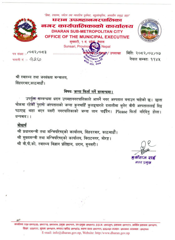 ‘उपर्युक्त सम्बन्धमा धरान उपमहानगरपालिकाले आफ्नै नगर अस्पताल बनाउन चाहेको छ । छाता चोकमा रहेको पुरानो अस्पतालको जग्गा कुनचाँही कुलङ्घारले दलालीमा भुलेर वीपी अस्पताललाई दिइ पठाएछ थाहा भएन यसरी नगरपालिकाको जग्गा लान पाइँदैन । प्लीज फिर्ता गरिदिनु होला,’ उनले पत्रमा भनेका छन् ।