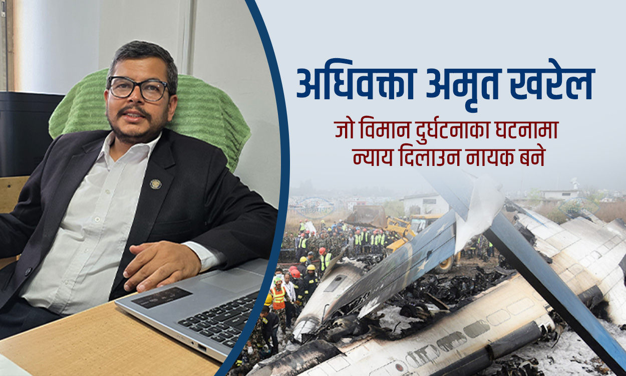 काठमाडौं । कुपन्डोलको हिमालय होटेल नजिकै एउटा सानो घरको तेस्रो तलामा एउटा ल फर्म छ, ज्युरिस नेपाल ल एसोसिएट्स । उक्त ल फर्मको सञ्चालक हुन्, अधिवक्ता अमृत खरेल । नेपाल ल क्याम्पसमा टपर, सोही क्याम्पसमा ६ वर्ष तथा पोखराको पिएन क्याम्पसमा २ वर्ष गरी ८ वर्ष अन्तर्राष्ट्रिय कानुनसमेत पढाइसकेका उनै खरेलको कार्यकक्षको एक कुनामा ठुला फाइलका चाङ थिए । ती फाइल अन्य फाइल नभएर एकै विषय वा मुद्दाका फाइल थिए । र, ती फाइलहरू थिए १२ मार्च २०१८ अर्थात् २०७४ फागुन २८ गते यूएस बंगला विमान दुर्घटनासँग सम्बन्धित कागजातहरू ।