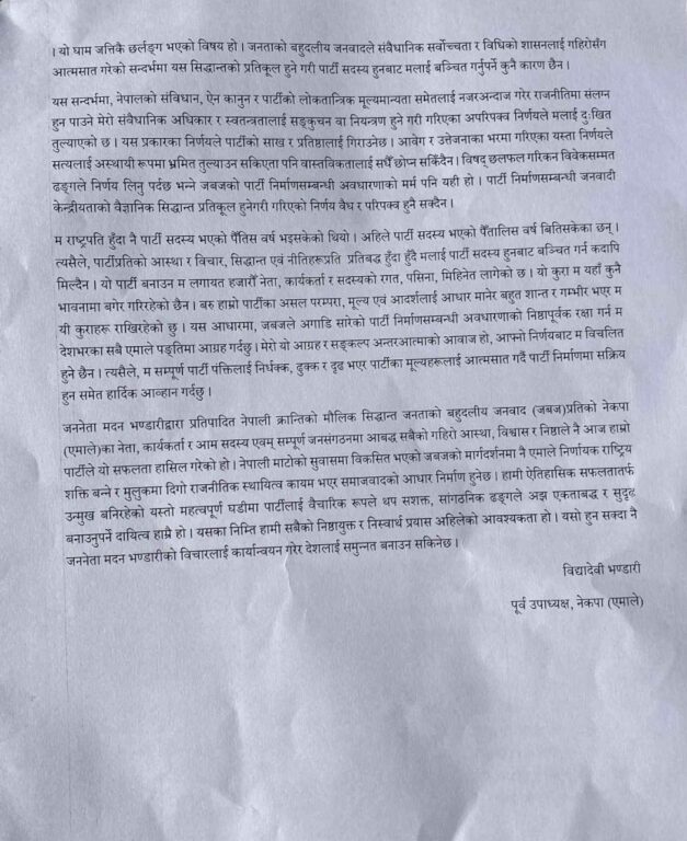 पूर्व राष्ट्रपति भण्डारीले जनताको बहुदलीय जनवाद र लोकतान्त्रिक मूल्य–मान्यता अनुसार चल्नुपर्नेमा जोड दिँदै वैज्ञानिक जनवादी केन्द्रियताको सिद्धान्तविपरीत भएको कुनै निर्णय वैध हुन नसक्ने टिप्पणी गरिन् ।