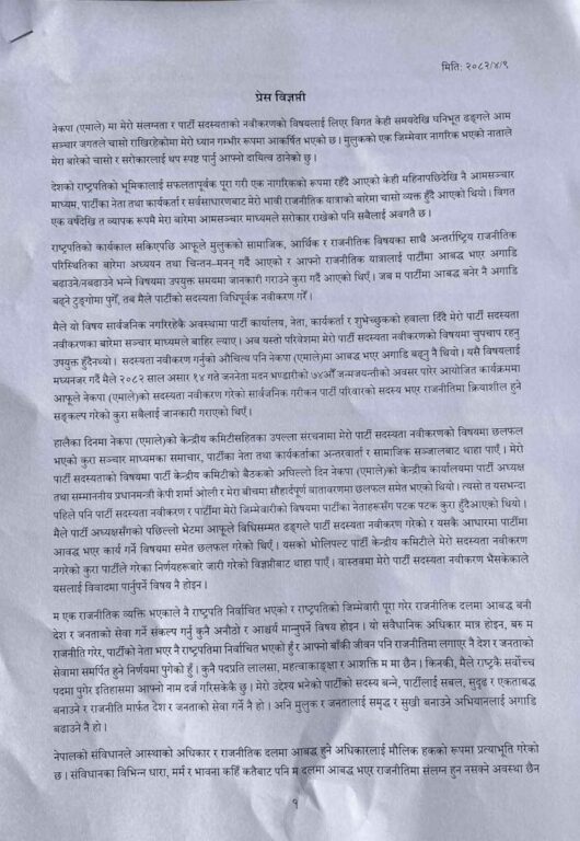 उनको स्पष्टोक्ति पछिल्लो समय नेकपा एमालेमा सक्रिय सदस्यता पुनः लिने उनको तयारीलाई लिएर उठेका प्रश्नहरूको सन्दर्भमा आएको हो ।