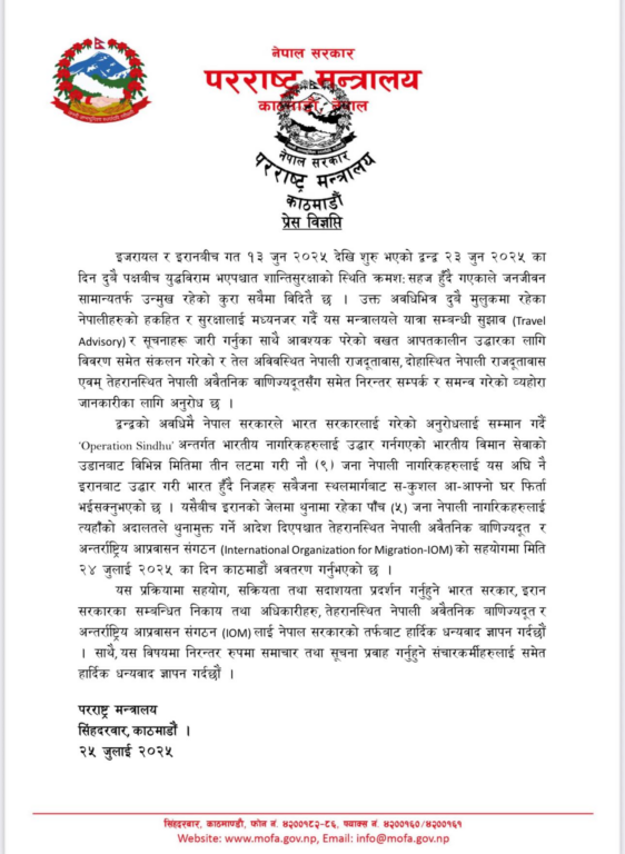 यसअघि, इजरायल र इरानबीच २०२५ जुन १३ देखि सुरु भएको द्वन्द्व जुन २३ मा युद्धविरामपछि सामान्य अवस्थामा फर्किँदै गएको थियो । द्वन्द्वको समयमा नेपाल सरकारले भारत सरकारमार्फत ‘अप्रेशन सिन्धु’ अन्तर्गत उद्धार अनुरोध गरेको थियो । सोही अनुरूप भारतीय विमानमार्फत तीन चरणमा गरी ९ जना नेपाली नागरिक इरानबाट भारत हुँदै नेपाल फर्किसकेका थिए ।