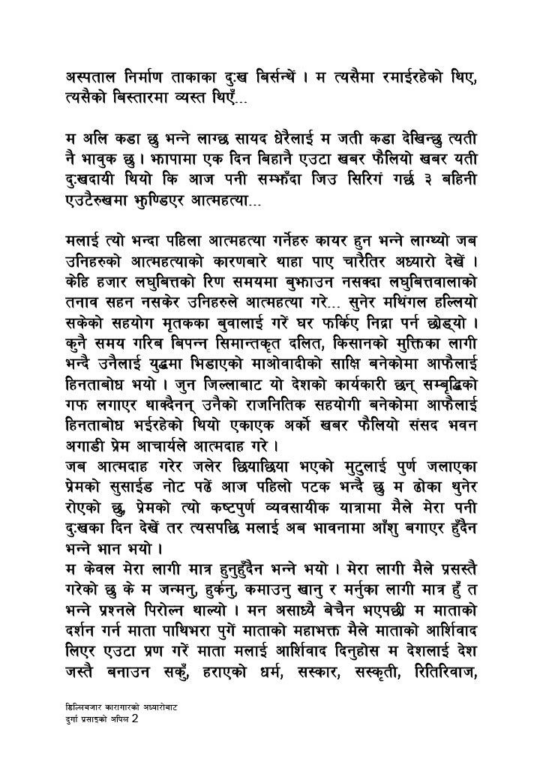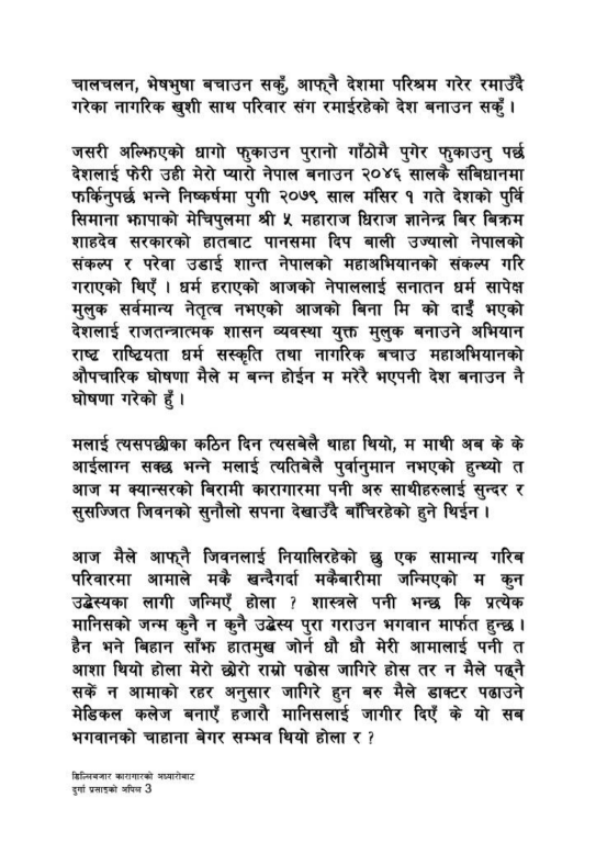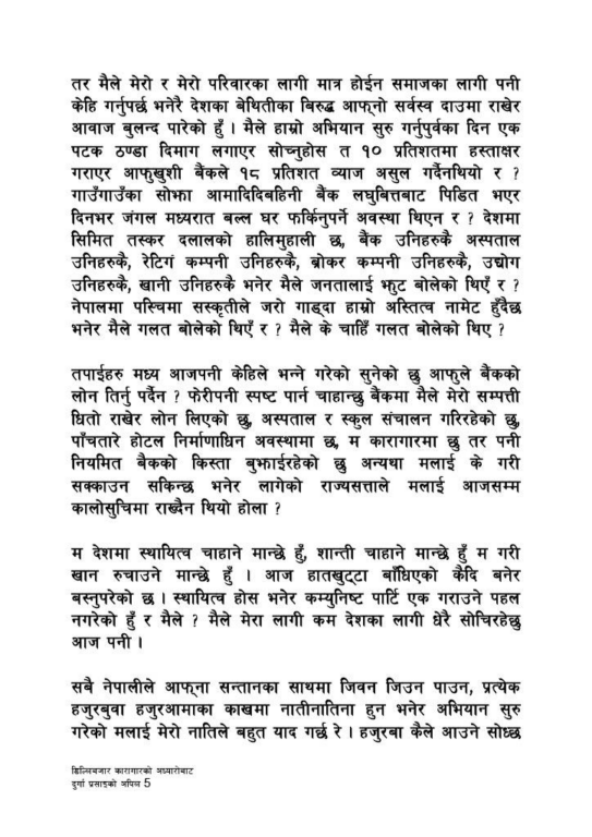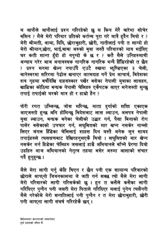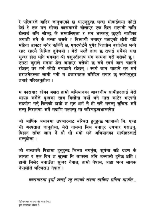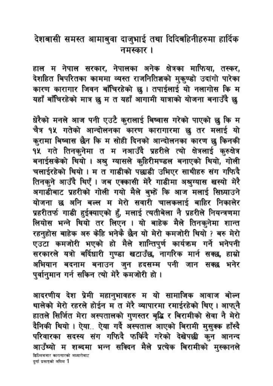 काठमाडौं । चैत १५ को तीनकुने घटनाका मुख्य आरोपी मेडिकल व्यवसायी दुर्गा प्रसाईँले डिल्लीबजार कारागारबाट भावुक अपिल जारी गरेका छन् ।