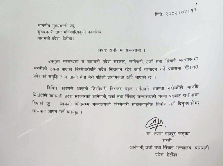 काठमाडौं । बागमती प्रदेश सरकारका खानेपानी, ऊर्जा तथा सिचाईं मन्त्री श्यामकुमार खड्काले पनि पदबाट राजीनामा दिएका छन् ।