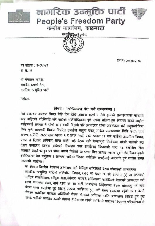 पार्टी केन्द्रीय कार्यालयबाट जारी गरिएको पत्रमा चौधरीले आफ्नो स्वास्थ्य असहज रहेकाले केही समयदेखि पार्टी गतिविधिमा पूर्ण रूपमा संलग्न हुन नसकेको उल्लेख गर्दै पार्टीभित्रका निर्णयहरूबारे जानकारी नदिई गरिएको कारबाहीप्रति असहमति जनाएका छन् । उनले पार्टी विधानको धारा १४ उल्लंघन गर्दै आफ्नो अनुपस्थितिमा केन्द्रीय समिति बैठक बोलाइएको भन्दै त्यसको स्पष्टिकरण माग गरेका छन् ।
