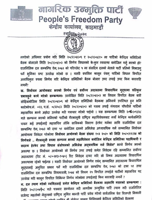 पार्टीका सांसद तथा नेता गंगाराम चौधरीको नाममा पठाइएको तीन वटा पत्र सार्वजनिक भएका छन्, जसमा पार्टी विधान उल्लंघन र केन्द्रीय समिति बैठकसम्बन्धी गम्भीर आपत्ति जनाइएको छ।