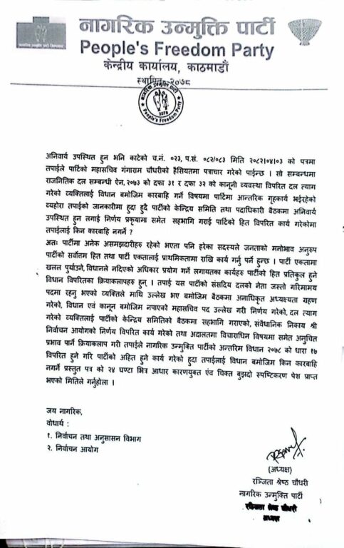 काठमाडौं । नागरिक उन्मुक्ति पार्टी (नाउपा) की निलम्बित अध्यक्ष रञ्जिता श्रेष्ठले संसदीय दलका नेता गंगाराम चौधरीसँग २४ घण्टे स्पष्टीकरण माग गरेकी छिन् । विधान विपरीत काम गरेको आरोप लगाउँदै उनले चौधरीसँग २४ घण्टाभित्र लिखित स्पष्टीकरण पेस गर्न माग गरेकी हुन् ।
