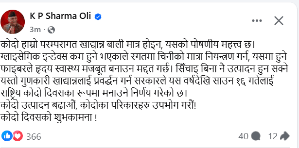 शुक्रबार सामाजिक सञ्जाल फेसबुकमार्फत शुभकामना सन्देश दिँदै प्रधानमन्त्री ओलीले कोदो हाम्रो परम्परागत खाद्यान्न मात्रै नभई पोषणीय दृष्टिले समेत अत्यन्त महत्त्वपूर्ण रहेको उल्लेख गरेका छन् ।