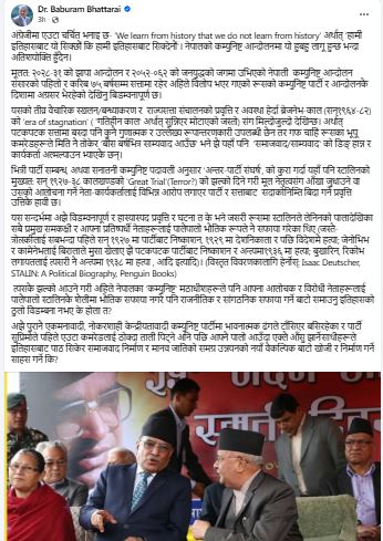 फेसबुकमार्फत भट्टराईले लेखेका छन्, ‘नेपालका कम्युनिस्ट नेताहरूले भौतिक सफाया नगरे पनि राजनीतिक र सांगठानिक रूपमा आलोचकहरूलाई हटाउने क्रम जारी छ, जुन इतिहासकै ठूलो विडम्बना हो ।’