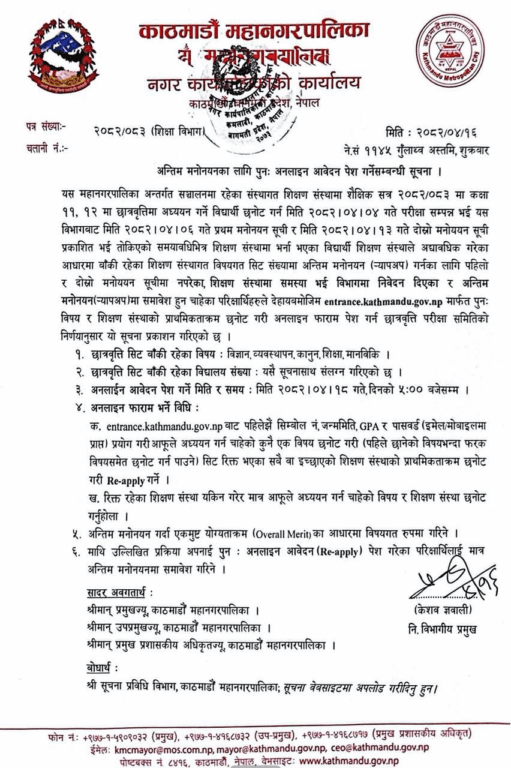 काठमाडौं। काठमाडौं महानगरपालिकाले शैक्षिक सत्र २०८२–०८३ का लागि कक्षा ११ र १२ को छात्रवृत्तिमा रिक्त रहेका सिटहरूमा पुनः भर्नाका लागि अनलाइन आवेदन खुला गरेको छ ।