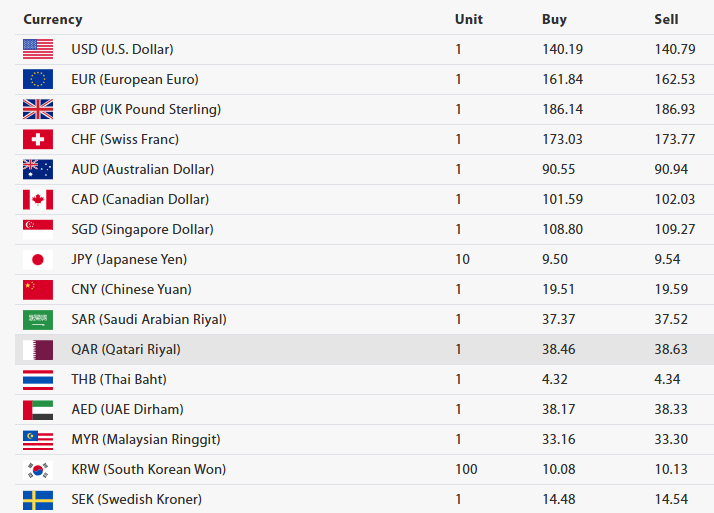 काठमाडौं । नेपाल राष्ट्र बैंकले आजका लागि विदेशी मुद्राको विनिमयदर निर्धारण गरेको छ । राष्ट्र बैकका अनुसार अमेरिकी डलर एकको खरिददर १४० रुपैयाँ १९ पैसा र बिक्रीदर १४० रुपैयाँ ७९ पैसा निर्धारण गरिएको छ ।