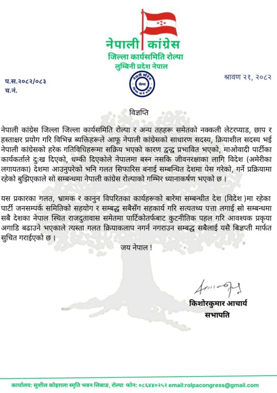 ‘नेपाली कांग्रेस जिल्ला कार्यसमिति रोल्पा र अन्य तहहरु समेतको नक्कली लेटरप्याड, छाप र हस्ताक्षर प्रयोग गरी विभिन्न व्यक्तिहरुले आफू नेपाली कांग्रेसको साधारण सदस्य, क्रियाशील सदस्य भई नेपाली कांग्रेसको हरेक गतिविधिहरुमा सक्रिय भएको कारण द्वन्द्व प्रभावित भएको, माओवादी पार्टीको कार्यकर्ताले दुःख दिएको, धम्की दिएकोले नेपालमा बस्न नसकी जीवनरक्षाका लागि विदेश (अमेरिका लगायत) देशमा आउनुपरेको भनि गलत सिफारिस बनाइ सम्बन्धित देशमा पेस गरेको, गर्ने प्रक्रियामा रहेको बुझिएकाले सो सम्बन्धमा नेपाली कांग्रेस रोल्पाको गम्भीर ध्यानाकर्षण भएको छ,’ जारी विज्ञप्तिमा भनिएको छ ।