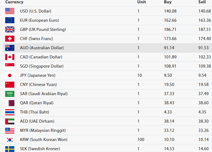 अष्ट्रेलियन डलर एकको खरिददर ९१ रुपैयाँ १४ पैसा र बिक्रीदर ९१ रुपैयाँ ५३ पैसा, क्यानेडियन डलर एकको खरिददर १०१ रुपैयाँ ८९ पैसा र बिक्रीदर १०२ रुपैयाँ ३३ पैसा, सिङ्गापुर डलर एकको खरिददर १०८ रुपैयाँ ९१ पैसा र बिक्रीदर १०९ रुपैयाँ ३८ पैसा तोकिएको छ ।