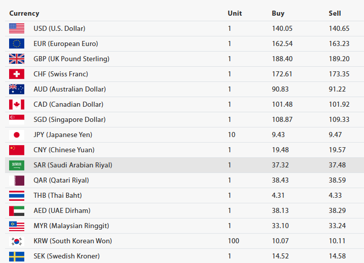 जापानी येन १० को खरिददर नौ रुपैयाँ ४३ पैसा र बिक्रीदर नौ रुपैयाँ ४७ पैसा, चिनियाँ युआन एकको खरिददर १९ रुपैयाँ ४८ पैसा र बिक्रीदर १९ रुपैयाँ ५७ पैसा, साउदी अरेबियन रियाल एकको खरिददर ३७ रुपैयाँ ३२ पैसा र बिक्रीदर ३७ रुपैयाँ ४८ पैसा, कतारी रियाल एकको खरिददर ३८ रुपैयाँ ४३ पैसा र बिक्रीदर ३८ रुपैयाँ ५९ पैसा कायम भएको छ ।