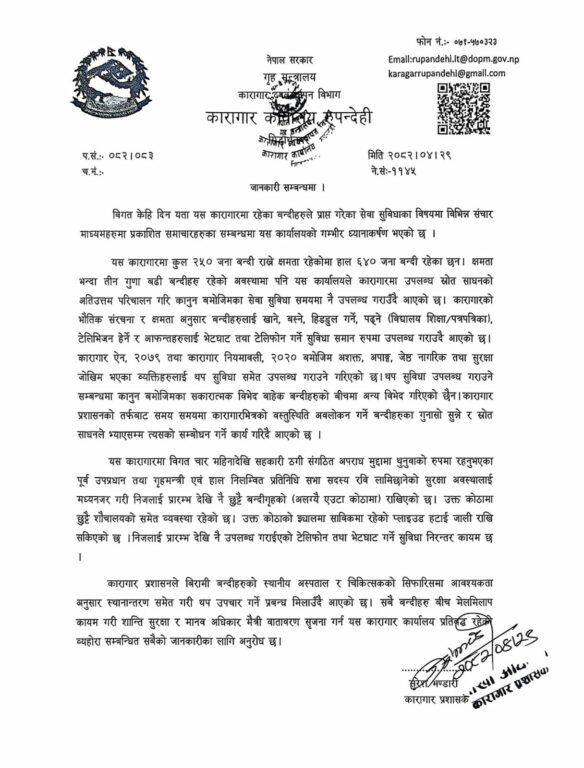 विगत केही दिन देखि यता संचार माध्यमहरुमा रुपन्देही कारागारका विषयमा विभिन्न समाचारहरु प्रकाशित भएपछि विज्ञप्ती मार्फत कार्यालयले ध्यानकर्षण भएको समेत जनाएको छ ।