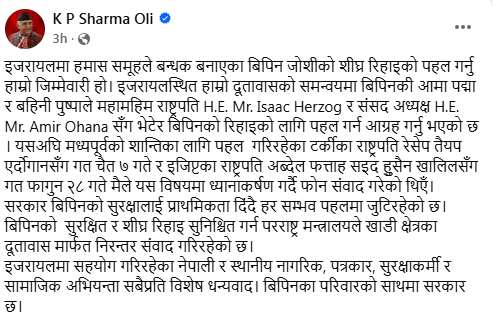 प्रधानमन्त्री ओलीले विपिनको रिहाइका लागि इजरायलमा सहयोग गरिरहेका नेपाली समुदाय, स्थानीय नागरिक, पत्रकार, सुरक्षाकर्मी तथा सामाजिक अभियन्ताप्रति विशेष धन्यवादसमेत व्यक्त गरेका छन् ।