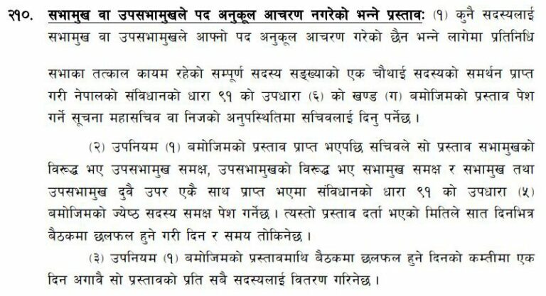 ‘कुनै सदस्यलाई सभामुख वा उपसभामुखले आफ्नो पद अनुकूल आचरण गरेको छैन भन्ने लागेमा प्रतिनिधि सभाका तत्काल कायम रहेको सम्पूर्ण सदस्य सङ्ख्याको एक चौथाइ सदस्यको समर्थन प्राप्त गरी नेपालको संविधानको धारा ९१ को उपधारा (६) को खण्ड (ग) बमोजिमको प्रस्ताव पेस गर्ने सूचना महासचिव वा निजको अनुपस्थितिमा सचिवलाई दिनुपर्नेछ ।’