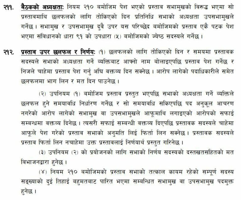 ‘नियम २१० बमोजिमको प्रस्ताव सभाको तत्काल कायम रहेको सम्पूर्ण सदस्य संख्याको दुई तिहाइ बहुमतबाट पारित भएमा सम्बन्धित सभामुख वा उपसभामुख पदमुक्त हुनेछ ।’