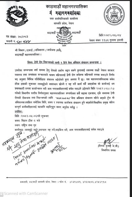 महानगरपालिकाले शुक्रबार आयोजना गर्न लागेको ‘वाल्क एण्ड एक्ट (खोज र नष्ट गर)’ अभियानमा महानगरपालिका अन्तर्गतका सबै विभाग, इकाई, सचिवालय र आयोजनाका कर्मचारीहरू सहभागी हुनेछन्।
