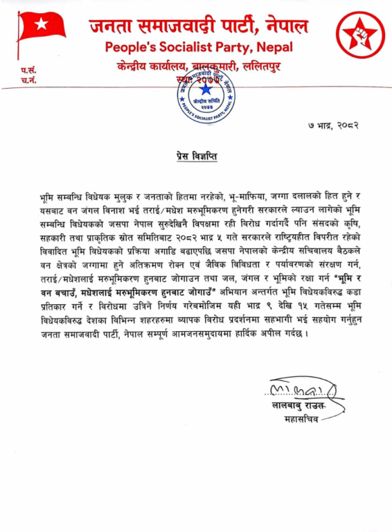 काठमाडौं । जनता समाजवादी पार्टी (जसपा) नेपालले सरकारले ल्याउन लागेको भूमि सम्बन्धी विधेयक मुलुक र जनताको हितविपरीत रहेको भन्दै कडा प्रतिकार गर्ने घोषणा गरेको छ ।