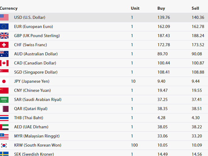 काठमाडौं । नेपाल राष्ट्र बैंकले आइतबारका लागि विदेशी मुद्राको विनिमयदर निर्धारण गरेको छ । राष्ट्र बैंकका अनुसार अमेरिकी डलर एकको खरिददर १३९ रुपैयाँ ७६ पैसा र बिक्रीदर १४० रुपैयाँ ३६ पैसा कायम भएको छ ।