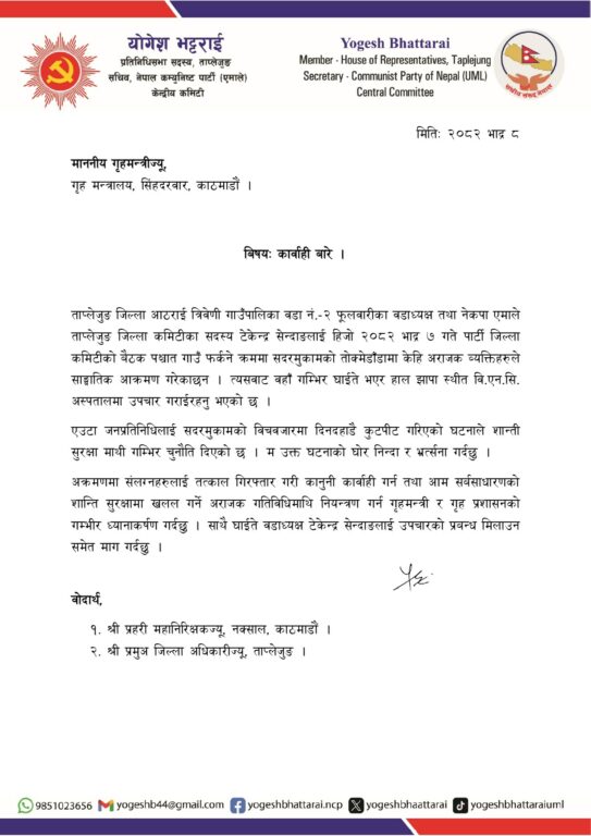 आफ्नो गृहजिल्ला र निर्वाचन क्षेत्रका वडाध्यक्ष तथा पार्टी जिल्ला नेतामाथि कुटपिट भएको भन्दै भट्टराईले गृहमन्त्रीलाई पत्र लेख्दै कारबाहीको माग गरेका हुन् ।