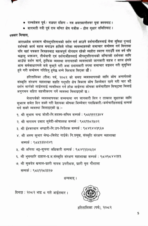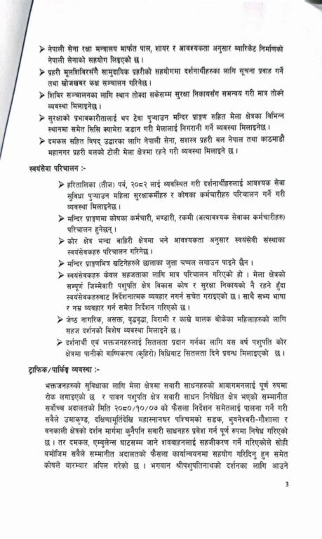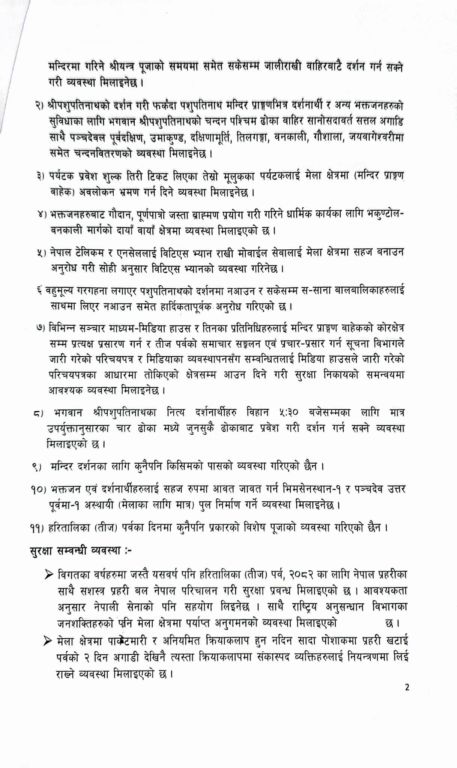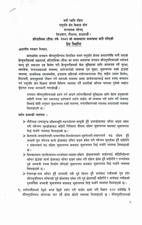 कोषले तीजका दिनको व्यवस्थाबारे ११ बुँदे चरण सार्वजनिक गर्दै पशुपति मन्दिरमा चारै ढोकाबाट प्रवेश निर्गमन गर्ने व्यवस्था गरेको जनाएको छ ।