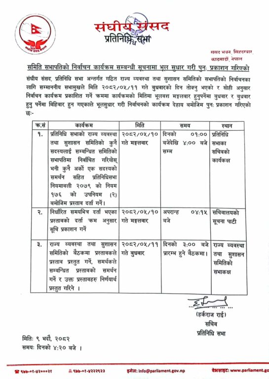 काठमाडौं । राज्य व्यवस्था तथा सुशासन समितिको सभापतिको निर्वाचनका लागि कार्यतालिका सार्वजनिक भएको छ ।
