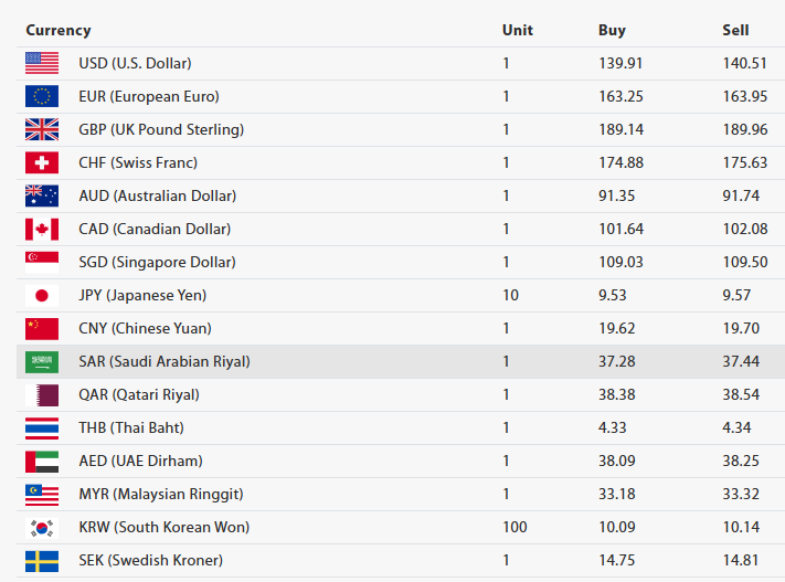जापानी येन १० को खरिददर नौ रुपैयाँ ५३ पैसा र बिक्रीदर नौ रुपैयाँ ५७ पैसा, चिनियाँ युआन एकको खरिददर १९ रुपैयाँ ६२ पैसा र बिक्रीदर १९ रुपैयाँ ७० पैसा, साउदी अरेबियन रियाल एकको खरिददर ३७ रुपैयाँ २८ पैसा र बिक्रीदर ३७ रुपैयाँ ४४ पैसा, कतारी रियाल एकको खरिददर ३८ रुपैयाँ ३८ पैसा र बिक्रीदर ३८ रुपैयाँ ५४ पैसा कायम भएको छ ।