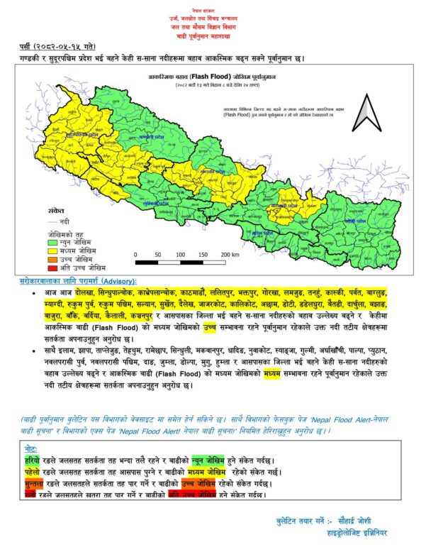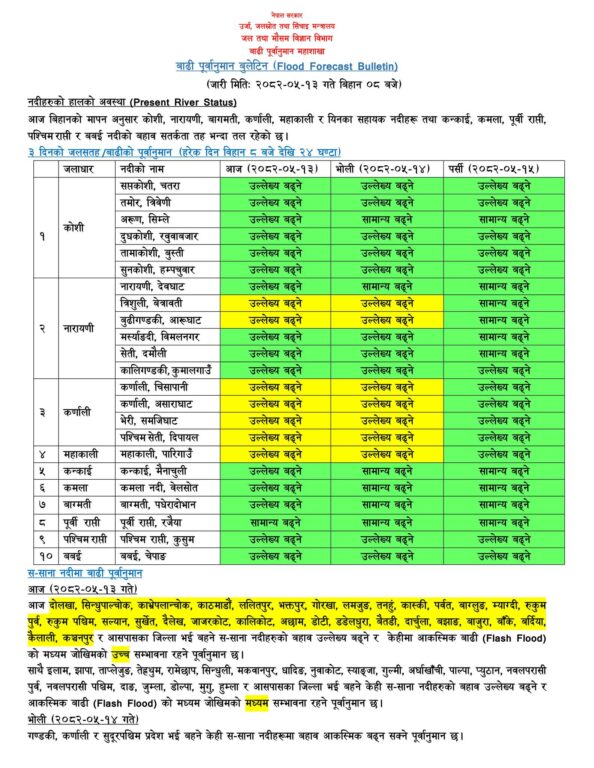 आज बिहानको मापनअनुसार कोशी, नारायणी, बागमती, कर्णाली, महाकाली, कन्काई, कमला, पूर्वी राप्ती, पश्चिम राप्ती र बबई नदीको बहाव सतर्कता तहभन्दा तल रहेको बाढी पूर्वानुमान महाशाखाले जनाएको छ ।