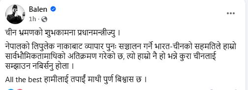सामाजिक सञ्जालमार्फत प्रधानमन्त्रीलाई शुभकामना दिँदै मेयर बालेनले लेखेका छन्, ‘चीन भ्रमणको शुभकामना प्रधानमन्त्रीज्यू। नेपालको लिपुलेक नाकाबाट व्यापार पुनः सञ्चालन गर्ने भारत–चीनको सहमतिले हाम्रो सार्वभौमिकतामाथि अतिक्रमण गरेको छ । त्यो हाम्रो नै हो भन्ने कुरा चीनलाई सम्झाउन नबिर्सनु होला ।’