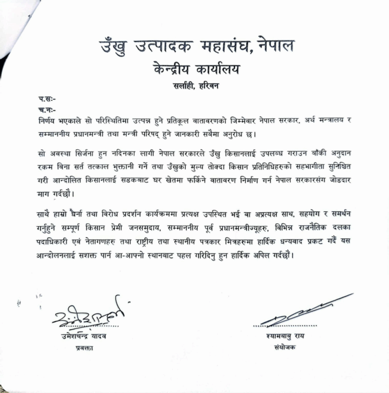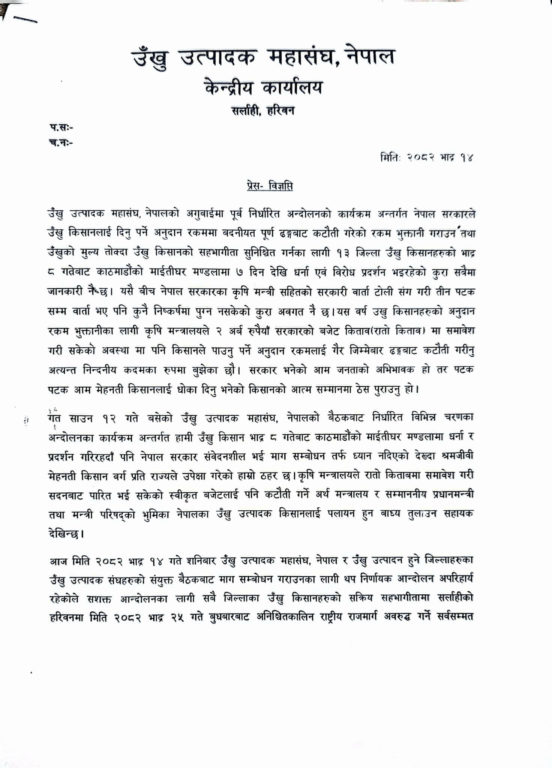 बैठकपछि जारी विज्ञप्तिमा भनिएको छ, ‘संयुक्त बैठकबाट माग सम्बोधन गराउनका लागि थप निर्णायक आन्दोलन अपरिहार्य भएकोले, सबै जिल्लाका उखु किसानहरूको सक्रिय सहभागितामा सर्लाहीको हरिवनमा २५ गते बुधवारदेखि अनिश्चितकालिन राजमार्ग अवरुद्ध गर्ने सर्वसम्मत निर्णय भएको छ । सो परिस्थितिमा उत्पन्न हुने प्रतिकूल वातावरणको जिम्मेवारी नेपाल सरकार, अर्थ मन्त्रालय र सम्माननीय प्रधानमन्त्री तथा मन्त्री परिषद्का हुनेछ ।’
