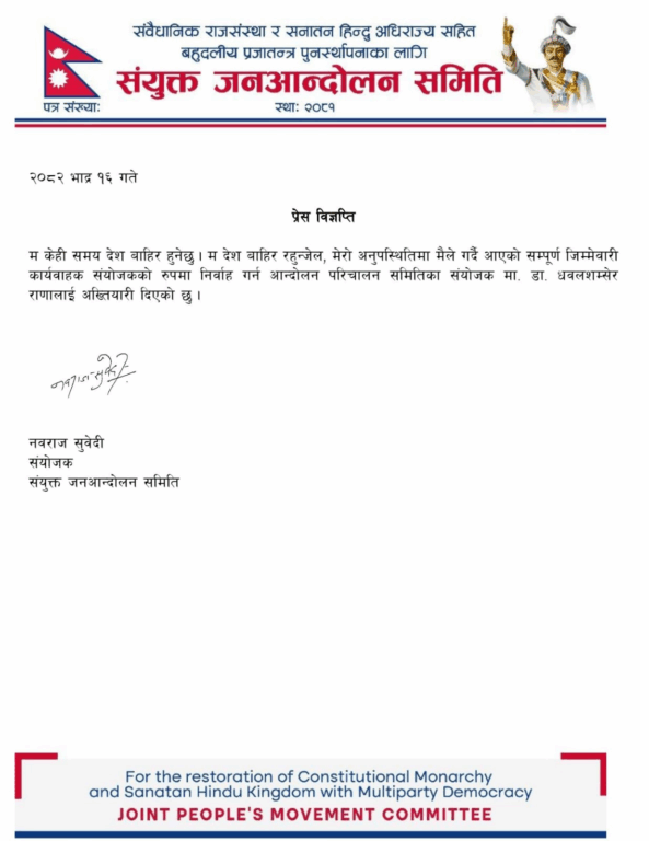 सुवेदीले सोमबार एक विज्ञप्ति जारी गर्दै आफ्नो अनुपस्थितिमा समितिको सम्पूर्ण जिम्मेवारी कार्यवाहक संयोजकको रूपमा निर्वाह गर्न सह–संयोजक डा. राणालाई जिम्मा दिएको जानकारी गराएका छन् ।