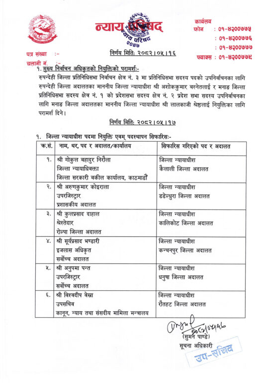 त्यसै गरी यसअघि दुई पटकको जिल्ला न्यायाधीशको नियुक्तिमा फालिएका उपरजिस्ट्रार कुलप्रसाद दाहाललाई पनि न्याय परिषद्ले यस पटक योग्य देख्दै जिल्ला न्यायाधीशमा सिफारिस गरेको छ ।