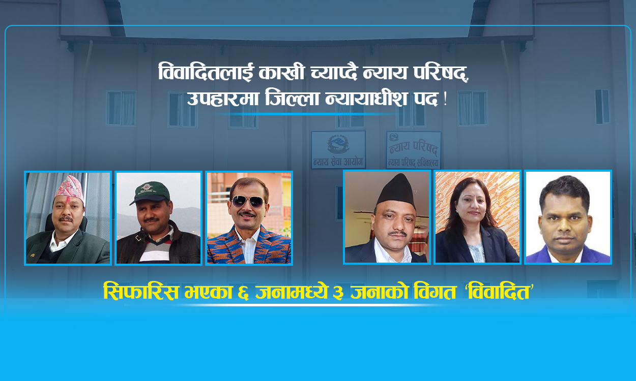 यसरी न्याय परिषद्ले मंगलबार जिल्ला न्यायाधीशमा ६ जनालाई सिफारिस गर्दा तीन जना व्यक्तिहरू पटक पटक छाडिएका र फालिएका तथा विवादित पात्र हुन् । तर उनीहरूले कानुनमन्त्री अजय कुमार चौरसिया र प्रधानन्यायाधीश प्रकाशमानसिंह राउतलाई नै प्रभावमा पारेर जिल्ला न्यायाधीश पदमा नियुक्तिका लागि सिफारिस पाउन सफल भएका छन् ।