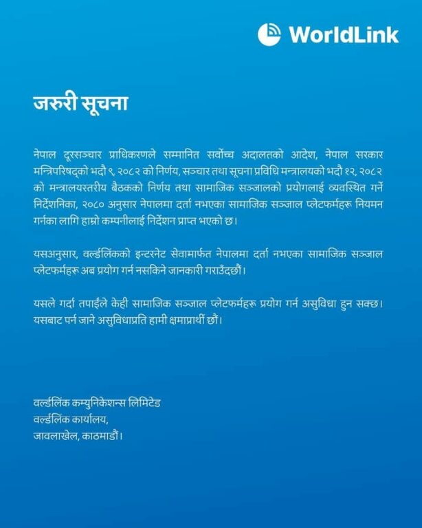 वर्ल्ड लिंकले आज शुक्रबार बिहान एक सूचना जारी गर्दै नेपाल दूरसञ्चार प्राधिकरणले दिएको निर्देशनबमोजिम नेपालमा दर्ता नभएका सामाजिक सञ्जाल प्लेटफर्महरू स बन्द गरिएको जनाएको हो ।