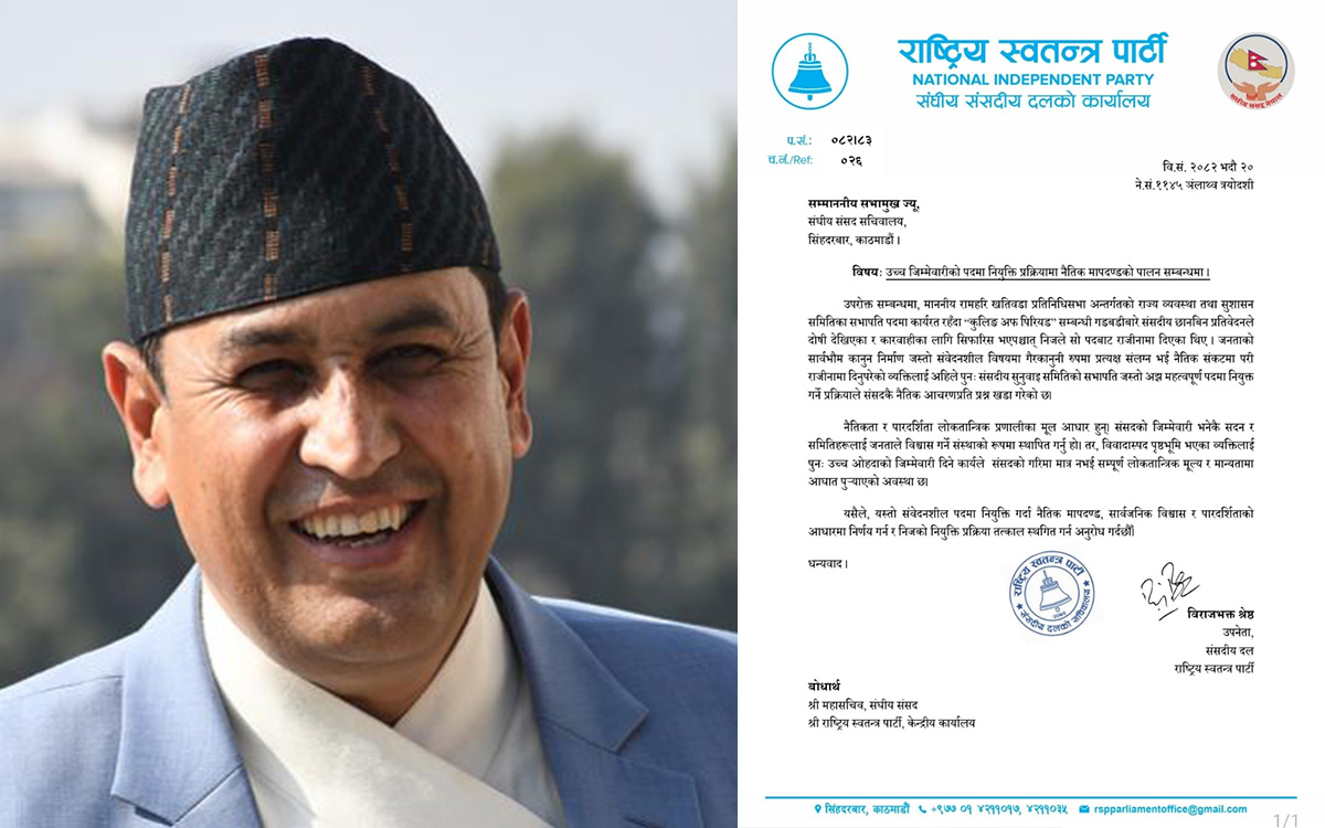 रास्वपा संसदीय दलका उपनेता विराजभक्त श्रेष्ठले त्यसबारे आपत्ति जनाउँदै विज्ञप्ति जारी गरेर सत्तापक्षको यस्तो निर्णयले संसदकै नैतिक आचरणप्रति प्रश्नचिह्न खडा भएको बताए ।