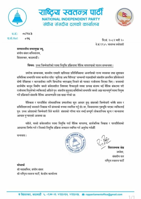 माननीय रामहरि खतिवडा प्रतिनिधि सभा अन्तर्गतको राज्य व्यवस्था तथा सुशासन समितिका सभापति पदमा कार्यरतरहँदा ‘कुलिङ अफ पिरियड’ सम्बन्धी गडबडीबारे संसदीय छानबिन प्रतिवेदनले दोषी देखाएका र कारबाहीका लागि सिफारिस भएपश्तात निजले सो पदबाट राजीनामा दिएका थिए । जनताको सार्वभौम कानुन निर्माण जस्तो संवेदनशील विषयमा गैरकानुनी रुपमा प्रत्यक्ष रुपमा संलग्न भइ नैतिक संकटमा परी राजीनामा दिनुपरेको व्यक्तिलाई अहिले पुनः संसदीय सुनुवाइ समितिको सभापति जस्तो अझ महत्वपूर्ण पदमा नियुक्त गर्ने प्रक्रियाले संसदकै नैतिक आचरणप्रतिप्रश्न खडा गरेको छ,’ रास्वपाले विज्ञप्ति जारी गर्दै भनेको छ ।