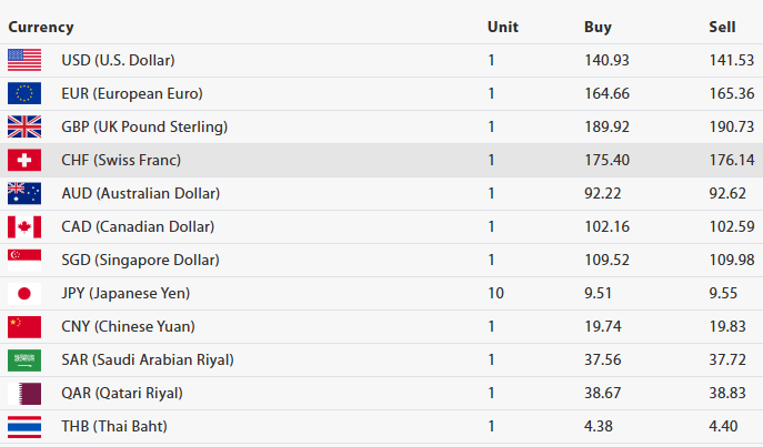 काठमाडौं । नेपाल राष्ट्र बैंकले आइतबारका लागि विदेशी मुद्राको विनिमयदर निर्धारण गरेको छ । राष्ट्र बैंकका अनुसार अमेरिकी डलर एकको खरिददर १४० रुपैयाँ ९३ पैसा र बिक्रीदर १४१ रुपैयाँ ५३ पैसा निर्धारण गरिएको छ ।