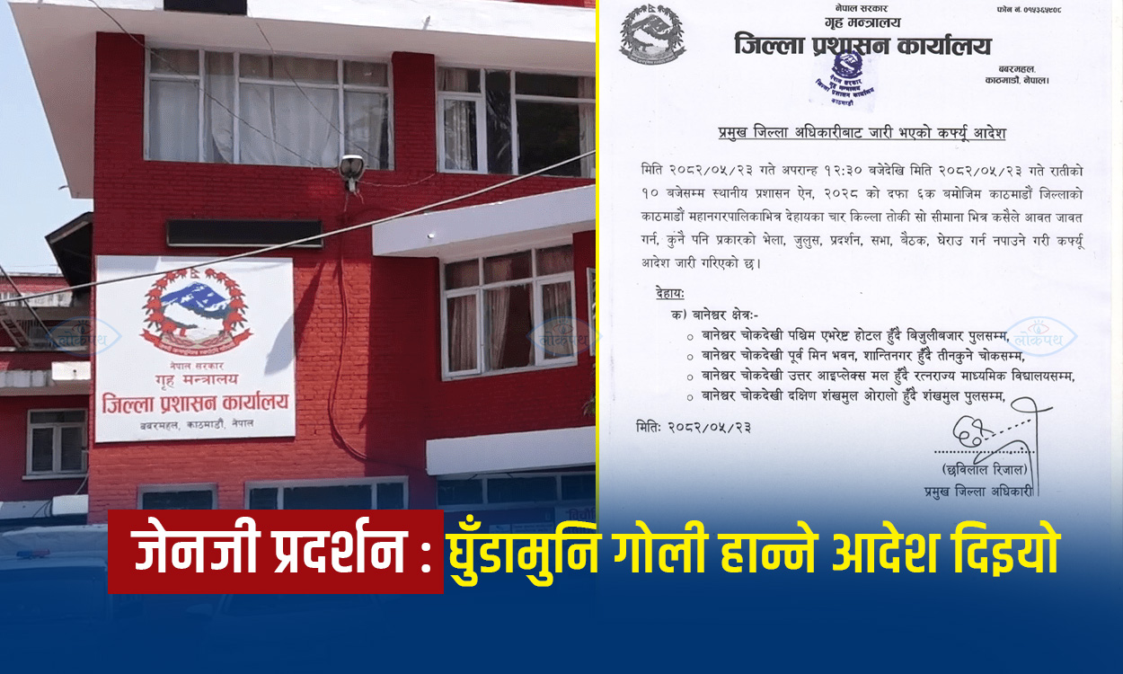 भ्रष्टाचार र सामाजिक सञ्जाल प्रतिबन्धको विरोधमा प्रदर्शनमा उत्रिएका जेन-जी पुस्ता संसद् भवन नयाँ बानेश्वरमा प्रवेश गरेपछि काठमाडौंकाे बानेश्वर क्षेत्रमा कर्फ्यु आदेश जारी भइसकेको छ । आन्दोलनकारीहरू संसद् भवनमा समेत प्रवेश गर्न थालेपछि प्रहरीले अश्रु ग्यासका साथै केही राउन्ड हवाई फायर समेत गरेको छ ।