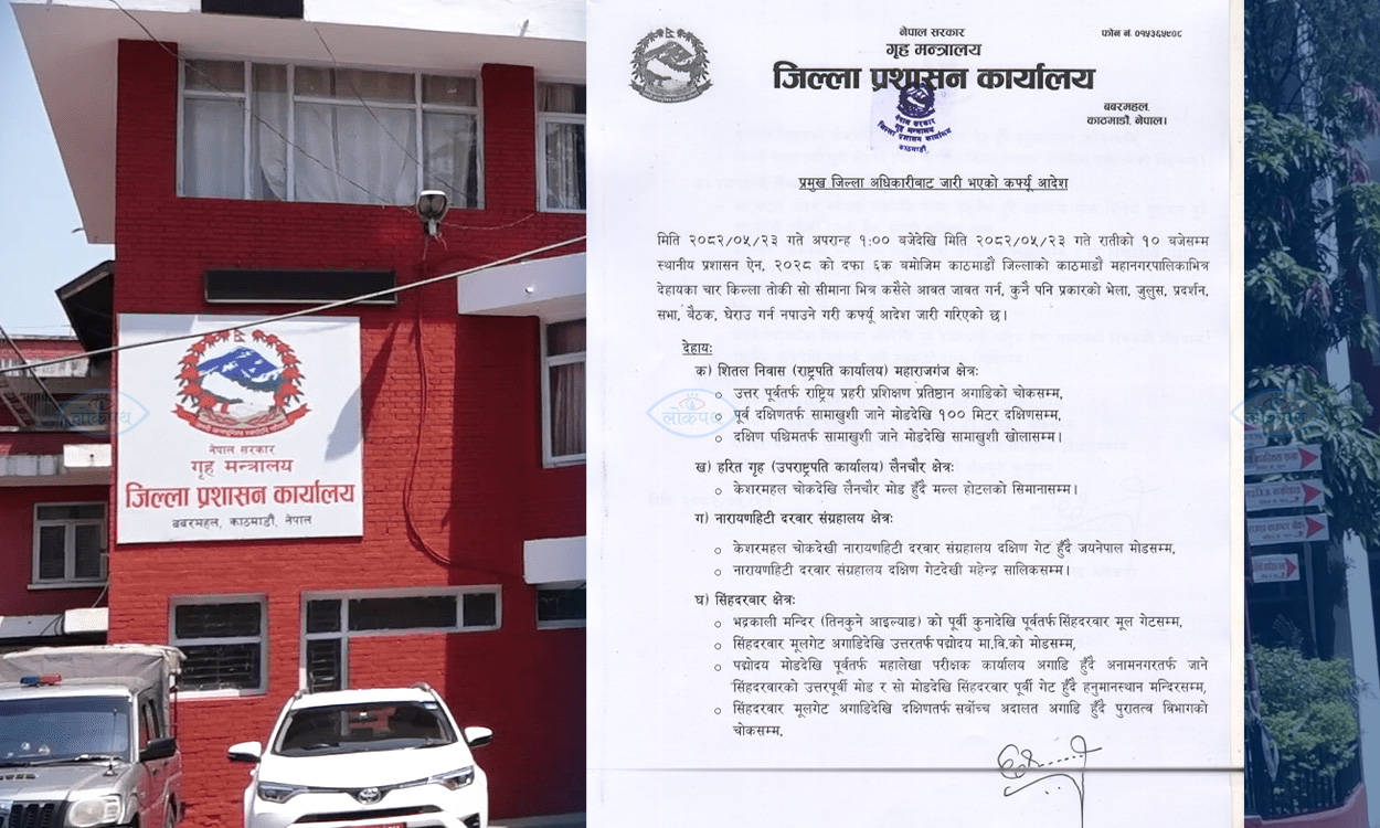 ‘मिति २०८२।०५।२३ गते अपराह्न १ बजेदेखि मिति २०८२।०५।२३ गते रातीको १० बजेसम्म स्थानीय प्रशासन ऐन, २०२८ को दफा ६क बमोजिम काठमाडौं जिल्लाको काठमाडौं महानगरपालिकाभित्र देहायका चार किल्ला तोकी सो सिमाना भित्र कसैले आवतजावत गर्न, कुनै पनि प्रकारको भेला, सभा, बैठक, घेराउ गर्न नपाउने गरी कर्फ्यु आदेश जारी गरिएको छ ।